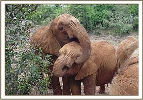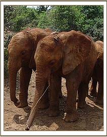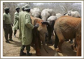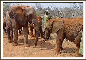 The convoy arrived at Ithumba by 1 p.m., all the elephants having travelled well, but for the tear in Sunyei’s ear, which was not serious. Whilst the newcomers awaited the arrival of the Ithumba ten, the Vet attended to Sunyei’s torn ear, but then the surrounding bushes exploded, and out came the Ithumba ten, led by Wendi! They arrived unexpectedly and in a rush which unnerved the new arrivals somewhat. Trumpeting, bellowing and rushing around dominated this reunion, which intimidated the Nursery group, especially Ndomot and Galana, who took to their heels. Hot on their heels were the older elephants, namely Yatta, Mulika, Kinna and Nasalot, who were every bit as exuberant in their welcome and probably the largest elephants some of the newcomers could ever remember seeing! Taita immediately homed in on Sunyei and had to be restrained a little, to allow the Nursery elephants some space. But by that evening, they had all settled in, and Ndomot was overjoyed to find himself reunited with the little mother he thought he had lost – namely “Wendi”.