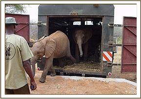 And so, a couple of days prior to Daphne and the family heading off to London on evening of the 3rd July for the launch of the BBC Natural History Unit’s series, “Elephant Diaries”, four of our nine precious Nursery Elephants embarked on the 7 hour road journey to Ithumba in Northern Tsavo were our Second Reintroduction Elephant facility is based. Having been fed in the two large Safari Trucks, parked against our Loading Ramp, only Galana was at first reluctant to go in, but when it came to departure, it was Sunyei who was most disturbed once inside the vehicle, during which, somehow she managed to tear one ear. Next door, the loading of Madiba and Ndomot proved a breeze, and by 6 a.m. on Saturday 2nd July, the four elephants were on their way, two to each truck, along with their Keepers, their milk, Madiba’s Lymph Drainage pillules, and everything needed at the other end. Our Mobile Veterinary Unit was in attendance, just in case any of the elephants panicked as did Napasha a year ago, and needed a sedative, although each truck was armed with a goodly supply of Rescue Remedy!