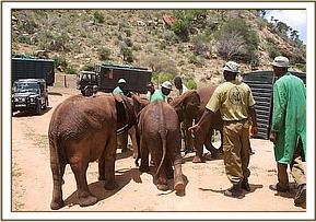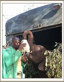With only four days of practice at going into the trucks parked at the Nursery Loading Bay, Shimba and Siria had no problem plucking up sufficient courage to go in for their milk. Wassesa was a little more apprehensive but was going in, and Mzima would have none of it! When the time came, however, Wasessa had very definite second thoughts, and vocalized these loud and long, which alerted the others to a possible problem! She proved the most difficult elephant Robert Carr-Hartley and his very experienced father, Roy Carr-Hartley (Who has been invovled in every orphan elephant move we have done) had ever had to deal with, and also arguably the largest, for Wasessa was a big two and a half year old with a couple of inches of tusk through the lip. Despite her apprehensive reluctance, and the fact that she was quite capable of flattening all the frail humans around her, she made no attempt to retaliate and eventually allowed herself to be muscled into the parked truck, testimony to the very gentle and tolerant nature of elephants to those they love despite their enormous strength. The door to her truck was hurriedly closed, and once inside with two Keepers by her side, she resigned herself to the inevitable and struggled no further.