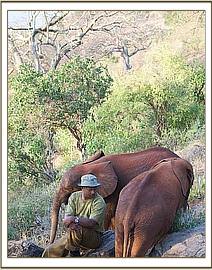 Having settled them in, fed them their milk and enjoyed a welcomed mudbath, and left them with their Keepers to explore their new surroundings, Robert and his father Roy went with Joseph Sauni in search of Emily’s unit to film an update on Emily’s two month old wild-born baby, little Eve. They found Emily and her entourage with the baby just behind Mazinga Hill, about seven kilometers away from the stockades, with tiny Eve as ever enjoying the fulltime attention of two of her many orphaned “Minders”, namely Edie and Sweet Sally. They are attentive to the baby’s every movement and every need. Little Eve just has to put her ears out and each Minder is with her in a flash, one on each side, gently propelling her back to her mother, who remains totally relaxed, secure in the knowledge that her baby must surely be the most spoilt little elephant in the world. Eve has a herd of “Minders”, besides the two Chief Nannies, amongst whom is Laikipia, the oldest and largest bull of Emily’s unit, who can always be counted upon to ward off over-eager “Baby Snatchers” from the wild community. What happened to one such wild candidate, is recorded in the January 2009 Keepers’ Diary, who incurred the wrath not only of Emily herself, but each Minder in turn, and who was eventually “Victory Mounted” by Laikipia who stepped in to finalize the issue!