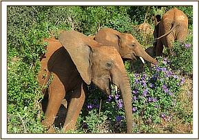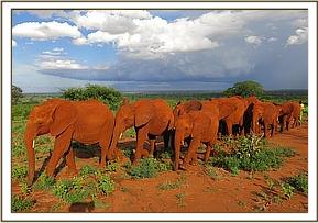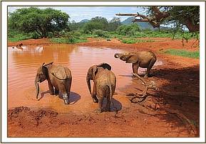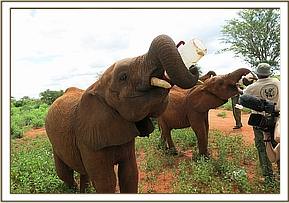 The Voi orphans day begins at dawn, when they are let out of their night stockades. Those still reliant on milk rush to enjoy their first milk feed of the day while the others who have already been weaned off milk go to enjoy the supplements provided for them, where they are sometimes joined by visiting ex-orphans now living wild, who remain in touch. (All of the orphans regard themselves as one large loosely affiliated family and whenever they happen to be in the area wild ex-orphans visit the juniors either together as a herd, often with wild attachments they have befriended, and sometimes individually or in splinter groups who separate from the main herd, but return to it later. At all times the orphans know the whereabouts of each other, communicating with low frequency infra-sound which carries over distance, and is hidden to human ears. Sometimes the ex-orphans meet up with the dependent youngsters when they are out in the bush or at the noon mudbath wherever it happens to be taking place. Should one of their number be recuperating in the hospital enclosure, they come to visit him or her, just as we humans visit loved ones in hospital.