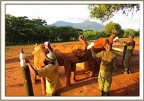 As noon approaches, the milk dependent elephants become restless, eager for their midday milk ration. They are aware of the time, and with their Keepers they begin heading to the mudbath venue where their milk will be awaiting them. Meanwhile the milk has been mixed back at the Stockades and transported in bottles to the mudbath venue, which, during the wet seasons takes place in natural waterholes that provide a swimming pool for the elephants. However, during long dry periods water has to be brought in to provide the mudbath which is an integral part of good skin care in elephants, who have no sweat glands and have to regulate their temperature by other means. As the milk dependent babies take their milk, the older Elephants drink from the drinking bins provided, which are filled with clean water daily for that purpose. The wild herds often turn up ahead of time, emptying the drinking bins before the arrival of the orphans, so the bowser has to make another trip! More recently one of the Keepers is left to guard the drinking bins, to avoid them being emptied by wild visitors.