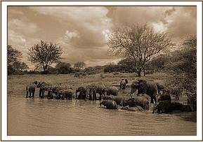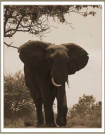 How can we possibly describe the feeling of pride and awe we experience when we see Dika as he is today, a huge, impressive bull elephant towering over the other elephants, with fine long white tusks, and back where he rightly belongs leading a life of freedom that is the birthright of all wild creatures. Today Dika roams the great 8,000 square mile wilderness that is Tsavo, which reaches beyond all visible horizons, just as a confident bull elephant should. Yet, when he returns, which he does only infrequently, he is as gentle and trustworthy as ever. What greater reward for all our labours than this! Testimony to this is an incident that happened about four years ago, when, after an absence of several years, Dika returned to the Night Stockades in Voi, trailing a snare around a back leg, and with a wound near his temporal gland on the face. Without hesitation, he simply extended the snared leg, and without flinching, allowed the Keepers to remove it, which must have entailed pain, since the cable had dug deep into the flesh. Then he allowed our Head Keeper, Misheck, to reach up and syringe out his temporal wound, which was sceptic and badly infected. For several days thereafter, he returned to have his face wound treated, and once it was on the mend, off he went again to who knows where, on his bull elephant travels.