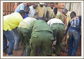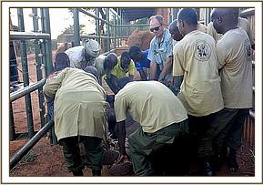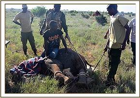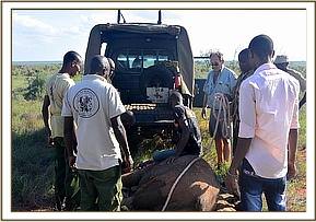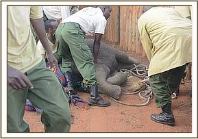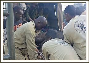 All attention now focussed on rescuing her still milk dependent calf and the Voi Keepers and Anti-Poaching Team, together with DSWT Field Manager Trevor Jennings were called to assist. Once the teams arrived they were able to capture the female calf without anesthetisation and she was loaded into the waiting Landcruiser and driven slowly back through the Park to the Voi stockades where she was placed in a taming stockade.