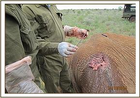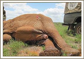 A seriously injured and ill elephant was brought to the attention of the DSWT/KWS Tsavo Mobile Veterinary Unit on the 19th of October, seen on the plains between Ndara and Dakota Tsavo East National Park. Remaining by her side was her small calf. The cow had multiple horrific arrow injuries, and due to septicaemia the prognosis regarding her recovery has very guarded. She was immobilised for treatment and meanwhile the calf remained nearby. When revived she was too weak to be able to stand, despite being helped with straps around her tusks, and she slipped away before everyone’s eyes.