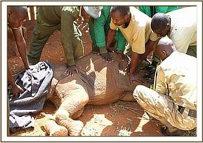 The entire stockade's workforce and the Nairobi Keepers were all needed to help to get the new arrival restrained and on the ground in order to brace her legs and keep her safe and secure during the flight. With all hands on deck the calf showed huge amounts of strength in managing to evade being taken down, yet after a few minutes she succumbed to the keepers, whilst ex-orphan Emily bellowed and stomped around the stockades concerned about what was happening to her.