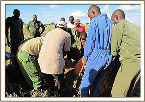 The calf was quite a weight and again all hands were needed to lift her into the waiting vehicle and to get her to the airstrip. The transfer went smoothly and within half an hour the calf was being lifted into the plane, strapped securely inside with an IV drip administered to ensure she stayed hydrated during the flight, and a mild sedation to keep her calm.