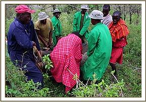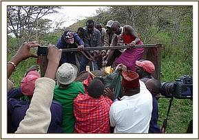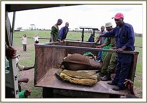 //www.youtube.com/watch?v=DAmNtjSOeDEWe received a phone call from Calvin Cottar regarding this rescue on the 8th of October but due to the late hour and the fading light it was too late to arrange. The following morning on the 9th of October we received a call from the Camp manager informing us that the calf was still there, and in desperate need of rescuing because her condition was visibly deteriorating. With a den of hyenas living closeby with each passing day and night her chances of survival were lessened. There were no herds of elephants in the area, and Cotters 1920’s is situated very close to the Tanzanian border. The fate of her mother remained unknown, but she was a suspected poaching victim, probably from Tanzania.