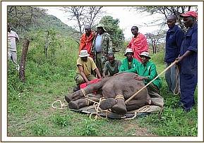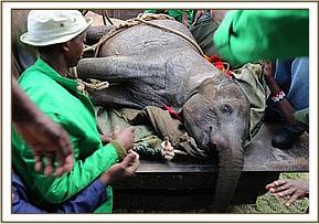 Our rescue team landed at the airstrip close to the camp and was transported to where the elephant was by the lodge staff. The capture was dramatic as they had to restrain her with their usual technique of a blanket thrown over the head and then restraining her behind the ears and neck. They tranquilized her at this point to reduce the stress levels, but it became evident she was too large to fit in the lodge vehicle to be transported to the airfield. There were many people present assisting in the rescue of this 20 month old baby and the lodge staff provided enormous support and assistance, providing a tractor and trailer to transport the calf back to the waiting plane so that she could be loaded, strapped and secured and placed on a drip for the duration of the flight.