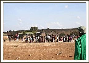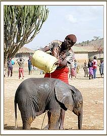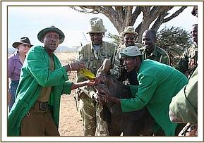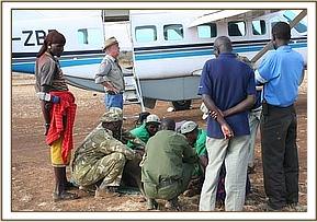 While the rangers and the Samburu men who first found the calf waited patiently at the airstrip for the plane to arrive, they ensured he was kept cool by pouring water over him which they ferried from the Mugie school situated on teh airfield. Guests of Clause Mortinson's (The owner of Mugie ranch) came down to the airstrip to be a part of proceedings and Cynne Flaconer-Taylor was able to perform 'body talk' on the calf and he responded immediately which amazed the curious onlookers.