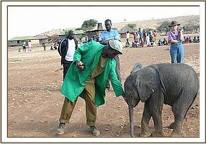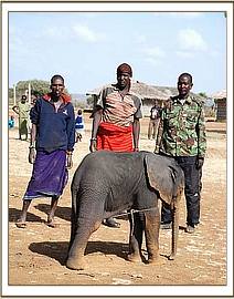 Another Sunday, the 15th March 2009, and yet another Elephant Rescue alert, this time again from the area around the Kirisia Hills near Maralal in Northern Kenya. The casualty this time was a 5 month old bull calf who became hopelessly bogged in the mud of a drying waterhole of an area known as Baawa during the night of 14 /15th March, and was found in the morning by Samburu cattle herders. They, in turn alerted the Chief, who was reluctant to save the calf at first because of a recent incident, a week before, where a man was killed by an elephant. He was persuaded by KWS Rangers that the calf must not simply be left to die, but should be rescued. These particular KWS Rangers, and indeed the KWS Warden of the Area, are familiar with the Trust's Orphans' Programme, and they not only orchestrated the rescue of the calf, but drove him to Mugie airfield to link up with the Rescue Plane sent from Nairobi.