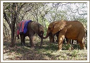 bruised and sore, he is taking milk eagerly and in pretty good physical shape. Within just one night, by the next morning he was no longer aggressive towards the Keepers and sufficiently settled to be allowed out with the others. There was great excitement when the others were let out of their Night Quarters. Immediately they practiced their newly acquired trumpets by first chasing their baby warthog friends around, and then hurried to greet the newcomer, who looked decidedly bewildered to find himself suddenly in amongst others of his kind and size! Since he seemed so happy to be amongst them, and quiet enough to be trusted around humans, and having been a totally wild elephant just 12 hours earlier, amazingly he was out and about with the other Nursery babies the very next morning.