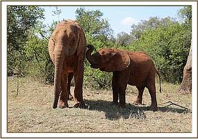 Right from the outset she was a gentle calf, with an easy nature, and she very soon recognized she was being helped and cooperated fully. Of course you could not help notice her sad demeanor; she clearly missed her loved ones. She also had terrible worms, but we waited a couple of days before risking deworming her, as it was that tricky catch twenty two, having to ensure enough strength in order to deworm her, but at the same time knowing that the longer one left it the more the worms compromised her strength and recovery. Thankfully she coped with the injectable deworming well and was soon strong enough to spend the days out with the other elephants. She instinctively knew she was weaker than the rest and chose to keep her distance from the boisterous youngsters, mindful that she could be pushed to the ground very easily, but as the weeks passed her strength increased and her confidence and happiness too. She became incredibly close to a much younger female calf rescued a few days after her arrival called Dupotto. They have helped each other heal which has been very touching to watch.