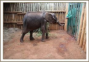 The calf arrived in the late evening. With her thick layer of black hairs she looked typical of Mount Kenya elephants. She was emaciated, clearly having been without her mother for a good long time. The first days in the Nursery were very much touch and go with her collapsing and requiring IV fluids in order to get back to her feet. Fortunately she continued to feed and this slowly enabled her to gain strength over the coming days.