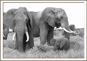 The Trust’s Mobile Veterinary Unit monitored the calf and its unique Protectors for the rest of the day, hoping that perhaps the mother might appear to reclaim her baby, for without access to milk, the calf had no chance of survival and milk was the only commodity this spectacular herd of males could not produce. The baby in their midst looked relaxed amongst them, but was already beginning to show signs of milk deprivation, its cheek bones becoming prominent.