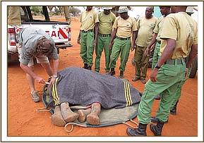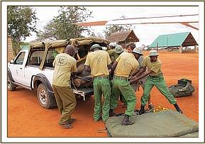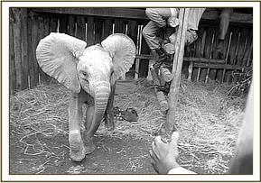 Meanwhile about six of the most experienced Elephant Keepers from the Trust’s Voi Rehabilitation Centre were brought in, the fact that an Elephant Rescue could be imminent having been reported to the Kenyan Wildlife Service. Time was now of the essence. The Veterinary Unit vehicle carrying the Keepers drove in tandem with Robert Carr-Hartley's landrover and together they drove determindly into their midst. Taken entirely by surprise, and not accustomed to such effrontery, they took to their heels, leaving just two or three around the calf, who had been left behind not able to keep pace with the fleeing adults. Ignoring the threats of the baby’s remaining Protectors they managed to separate the calf, and steer it towards the Pickup carrying the Keepers. The Protectors lost their nerve at the last minute and decided that discretion was the better part of valour, leaving the yearling calf to its fate. Instantly the Keepers leapt from the Pick-up carrying them, and threw a blanket over the calfs head and eyes as they moved in to overpower it and grapple it to the ground. The baby was approximately a year or just over, and not as strong as he should be were he well fed. Soon, he was held on the ground, and his legs were bound with special strapping before rolling him over onto the rescue tarpaulin and heaving him up onto a mattress in the back of a Pickup vehicle to be driven to the Voi Stockades. Overnight he was in with Kenia and little Kimana, adjacent to the other 13 orphans currently in the process of rehabilitation at the Voi unit’s base. Kenia is a very gentle and caring ex Nursery Matriarch, and Kimana the smallest elephant at the Voi Stockades, although not the youngest, who adores her and suckles her ears constantly. The newcomer was careful to squeeze himself between the two, and when they took their milk, he also decided to do the same, as long as he was in the middle and as such not exposed to a human!