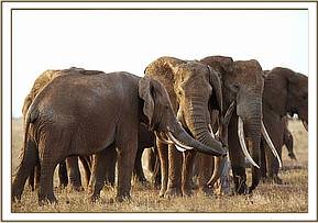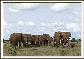 During a surveillance recce searching in Tsavo East National Park area for one of Tsavo’s enormous Tuskers on the 16th June 2010, Robert Carr-Hartley came across a majestic Bull with perfectly symmetrical tusks that reached to the ground, a rare spectacle today and the epitome of awesome power and beauty. The following day on patrol the mobile veterinary unit came across the same bull together with a herd of handsome bulls. He was amazed to find so many handsome bulls all together in one large grouping, with no female herds anywhere in sight, and even more surprised to spot amongst them, looking miniscule, a tiny yearling calf, quite obviously an orphan whom they were protecting from predation.