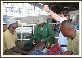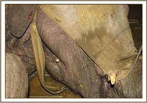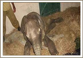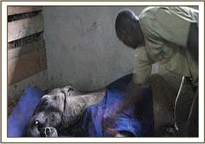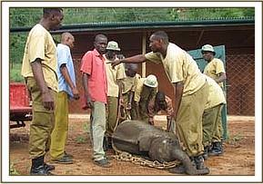 He arrived at the Nairobi Nursery at 11 a.m. on the morning of the 7th December, and one look at him made our hearts sink even further, for once again here was a candidate who was bound to sink into muscular dystrophy due to starvation exacerbated by both the trauma of capture, and two long journeys to safety, added to which he was literally plastered in ticks – huge great yellow elephant ticks on almost every square inch of his ears and body, in between colonies of small black ones. He also had a nasty suppurating wound on his belly, but it was important to get him to his feet quickly so after the first of what would have to be a 5 day prophylactic course of injectible antibiotic, he was lifted to his feet in the Taming Stockade. Here was another Sidai, Challa or Rapsu, who would need intensive care the moment he could be handled in a collapsed state, and from past experience, this we knew was inevitable, so we had the Vet standing by, and all the drips and medication in place. Only then, could we deal with the parasites, clean the wound on his belly and do our best to revive him through the insertion of saline and dextrose drip-fed into one of the large veins behind an ear.