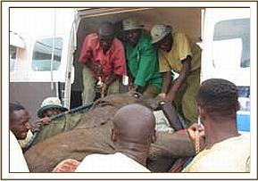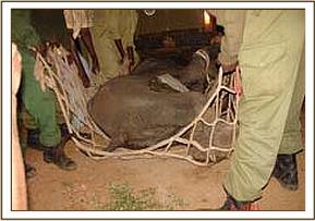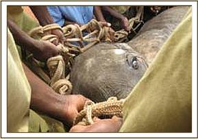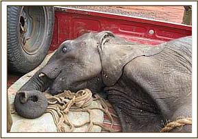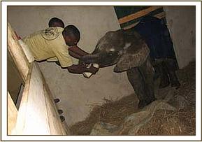 The Chyulu De-Snaring Team set out immediately accompanied by the tribesman who had brought the report, and within a short time, they spotted the young elephant very close to a village called “Kenze”. The elephant was in a very emaciated and advanced state of starvation, at 2 years old still milk dependent, and although extremely fearful of humans, had obviously come close to the village for protection against predators. Although enfeebled, he still had sufficient strength to put up a spirited struggle during his capture, but with the assistance of the villagers, who cooperated fully, he was successfully overpowered and loaded onto the back of the De-Snaring Pickup Truck. It being too late to arrange an air rescue that day, he had to endure the 3 hour journey strapped in the back of the Pickup to our Voi Elephant Rehabilitation Centre, where he was put in one of the new recently built small stables. These currently house our orphaned zebra foal “Serena” and the baby lesser Kudu named “Rukinga”, both of whom are being hand-reared by our Voi Elephant Keepers.