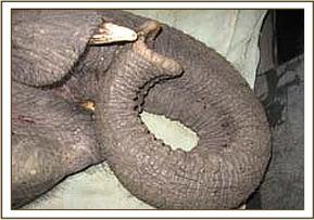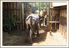 Right now, however, there was nothing we could do for he was extremely aggressive, and at two years old, armed with short tusks, even though weak, was still able to inflict serious injury should he succeed in pinning a Keeper against the bars of his Stockade. Clearly, this young newcomer, at this age, was yet another challenge, set to be a difficult customer, and the prognosis about being able to save his life was not encouraging. Meanwhile, we all awaited the inevitable collapse, which happened at 5 p.m.. Immediately, the life saving drip was able to be inserted into an ear, the wound on his penis and belly inspected and cleaned and the ticks removed by an application of T-Tree and Front Line Spray. We suspect that the injury to the tip of his penis and belly had been inflicted by a small carnivore such as a mongoose or dog, when he was lying down, for had it been a hyaena, it would have been far more serious. As it was, it was not deep. We were actually surprised to find him still with us in the morning, bottle after bottle of dextrose and Hartmans solution having flowed into his body throughout the night as he was attended by two skilled Keepers. He remained comatose and on the drip for the first half of the next morning, hovering precariously between life and death. However, he is obviously a survivor, who, having overcome all odds, was lifted to his feet at noon on the 8th, and wobbled with help into a far corner to lean against the bars of his Stockade. Still bent on attacking whoever approached him, he continued to resist milk for a further 48 hours, but devoured the fresh greens that were cut for him, avidly. It was, however, only milk that would save his life, so in the meantime Daphne prepared with SMA milk little balls of cooked oatmeal and desiccated coconut, which were stuffed into his mouth and swallowed whilst he was down. Eventually, he decided to try milk from a bottle held by a Keeper protected by the Gate to his Stockade, and having tasted it, began to long for each feed, gulping it down rapidly, before trying to flatten the Keeper. Gradually, his milk ration, reinforced with oatmeal and coconut gruel was increased and whenever he lay down to sleep, without the strength to remain standing during the nights, the Keepers were able to clean his wounds and cover him with a blanket as protection against the night chill. After a full week, once he responded to the word “No” and refrained from pushing home any onslaught, he was allowed out one afternoon to join the other Nursery inmates, one full week after arrival. Immediately he gravitated to Lenana, the elephant next door to him during the nights, and he and Lenana, who is still something of a loner, still grief-stricken for her lost elephant loved ones, have formed a strong bond of friendship, giving each other comfort and companionship, feeding close together, but keeping slightly apart from all the others. It is, indeed, a miracle that Kenze is alive to become the twelfth baby in our Nairobi Nursery today. Great credit goes to the Keepers who diligently struggled so hard for his life and who succeeded in narrowly cheating the Angel of death. Though still weak, and pathetically emaciated, he is recovering rapidly, eager to fill his starved belly with milk, and it is for that reason that today we have joy in being able to add his story to the website, our Christmas miracle baby.