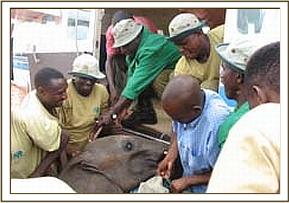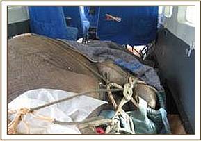 The two year old, already named “Kenze”, (at the request of the community), as usual had no liking for the human species, but the Keepers managed to cover him with a blanket, and get him to take milk and rehydration fluids overnight by pinning him in a corner. At first light the next morning the rescue plane set off fropm Nairobi heading for the Voi Park airfield, where the calf was waiting to be loaded loaded onto the plane and flown to Nairobi.