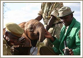 The 22nd May 2009 saw the arrival of another little orphaned elephant into our Nairobi Nursery, this time a male of approximately 5 – 6 months of age, who had been found alone and wounded, having somehow survived an attack by a predator, possibly a lone hyaena, because had there been more than just one, he would certainly not have been able to survive a pack assault. He was flown to the Nairobi Nursery from the Kilaguni Lodge airfield in Tsavo West National Park, and has been named “Kilaguni” since the Chyulu Gate is not far from the Lodge.