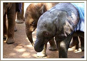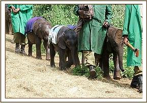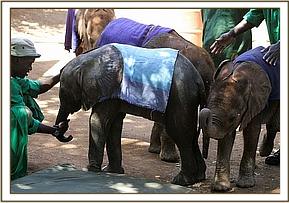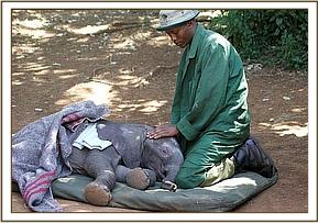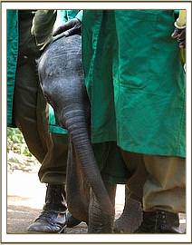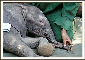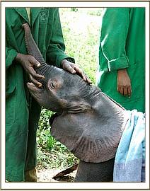 At the airfield, a curious crowd of onlookers had gathered, and as the calf was being loaded into the plane, Stephen along with his friend who had helped him explained that they lived harmoniously with the elephants that utilized their area and who posed no threat to their livestock. He understood that they generated tourist revenue for his community and were a priceless national heritage that benefited the Tourist Industry of Kenya. The KWS Representative present then explained that the organization’s community out-reach initiatives were now bearing fruit. Little Kilgoris, as we have named him, arrived in Nairobi at 2.30 p.m., already showing visible signs of the anticipated stomach upset following his intake of cows’ milk that had been given to him well meaningly while in Stephen’s care, to which elephant babies are intolerant. However, on arrival he hungrily downed 3 bottles of SMA and some rehydration fluid and having been anointed with sunblock to protect his petal soft ears, and had his sore eyes washed out with boracic solution, all he now needed was a good rest. Meanwhile, the other four resident tiny babies, namely Lesanju, Lempaute, Galdessa and Shimba were brought in to meet the newcomer, so that he would understand that he was not alone but with their minds only on their anticipated ration of milk, they arrived in a rush and hardly seemed to even notice the presence of a newcomer! However, their presence would surely have been reassuring to this very exhausted baby, who was gently laid on a mattress in the shade for what he needed most at this point in time - sleep.