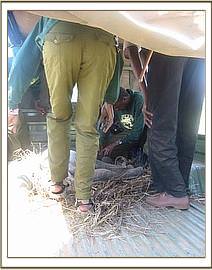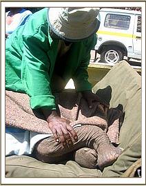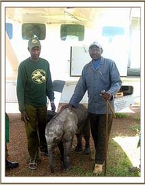 On the morning of the 25th a Maasai elder in the Kimaserian area was surprised by a most unusual visitor when a tiny baby elephant was found in his Boma amongst his cattle and sheep. This baby, still pink behind the ears, had been swept down the Mogor river as his mother and herd had attempted to cross the fast flowing river earlier that morning. It became evident he had been swept about 800 meters by the swift current before ending up on the shoreline of the opposite bank. Dazed and confused he had followed the sounds of the live stock emanating from a Maasai Boma not far from where he had been washed up. It is considered in Maasai custom to be extremely lucky if you receive an animal in your livestock boma in the morning, normally a small rabbit or something alittle more predictable, but Stephen Parmois Leshao was amazed on this day to find a tiny baby elephant in his boma, washed pink by the river, abandoned and confused looking for the company of his domestic livestock. He immediately tried to rescue the baby, as his elephant herd was no where to be seen, but the moment he moved closer to the calf it fled in the opposite direction. Stephen enlisted the help of his children and his dogs in order to round up the baby elephant and after much effort they eventually managed to capture the calf. They then tied him to a nearby tree while they deliberated as to what to do next. Stephen and a friend then decided to walk the calf to the closest KWS station to seek advice and help from the wildlife authorities. By this time the calf had settled down having fed the calf some cows milk and then a remarkable scene unfolded as Stephen and his friend set off on the 15 kilometer journey to the KWS station, across the plains of the Trans - Mara with this baby elephant following them. It is very encouraging that this man cared sufficiently to save this calf, and moreover the following day diligently laid it on a bed of hay, assisted by Anne Kent Taylor's desnaring team, in the back of the KWS Landrover Pickup which had been made available in order to transport the calf the following day 40 kms to the closest serviceable Airfield, where the rescue plane was waiting.
