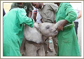 Officials from the Amboseli Trust for Elephants (ATE) soon arrived at the scene and were assisted by community members in extracting the calf, before loading the orphan into a vehicle to be driven to the Amboseli Park airstrip, from where it was met by the DSWT rescue team and soon airlifted to the Nairobi Nursery. The calf, a beautiful baby bull who was about 3 months of age on arrival, arrived at the Nursery by 5pm and has since been named Lemoyian. We feel for the mother elephant who is obviously grief-stricken having lost her calf, and we are incredibly saddened that this orphan could not have been reunited with his family, but since the well is very close to an international border, and the mother could well have crossed into Tanzania, it was not an option for the rescuers to attempt to reunite the family.