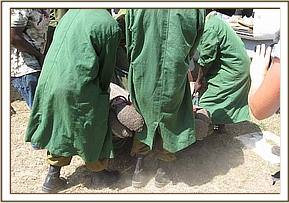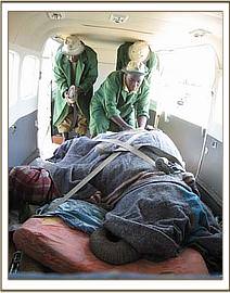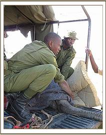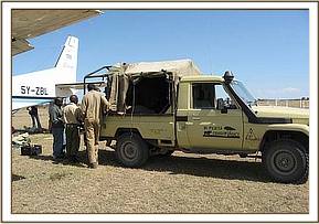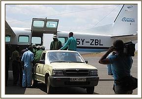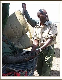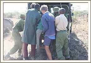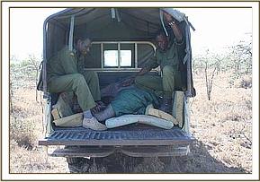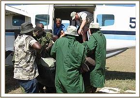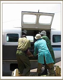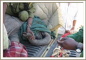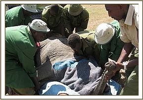 Apparently, it was heartrending to watch the calf, who was just over a year old, franticly doing everything possible to rouse her dead mother, alone and terrified in the hostile environment of darkness, beside the inert and cold body of a loved one that simply would not respond. Once all the arrangements were in place at the Nairobi end the following morning, and Ol Pejeta received word that the rescue plane was on its way, the calf was captured and taken to the Ol Pejeta Airstrip. The Keepers aboard the plane were armed with all the usual rescue paraphernalia i.e. the rescue tarpaulin, rehydration fluids and milk and an injectible antibiotic to forestall pneumonia and other stress related ailments. As soon as the plane landed, the baby was strapped onto the rescue tarpaulin, its legs and head stapped to avoid any possibility of it being able to struggle whilst airborne. Whereas at first it looked as though a serious ear infection had been the cause of the calf's mothers death, when an autopsy was performed, her condition was far more serious than just this. The entire spinal column was seriously infected as well, so she must have suffered unbelievable agony as septicemia drained away her life force. Obviously this had also affected her lactating capacity as well, because the calf was thin.
