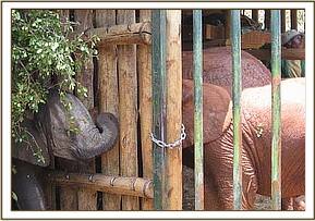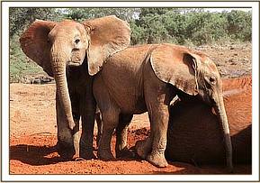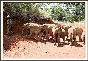 As usual, at first little Lenana was quite “wild” and aggressive towards the Keepers, but within just a few hours she could not resist hungrily downing her first milk feed offered her by a Keeper, before trying to pin him against the wall! The other eight Nursery elephants were brought in to meet, and comfort her, and that night she slept in what is known as “The Taming Stockade” next door to that occupied by Kora, the biggest boy in the Nursery, who, along with Lualeni (the biggest girl) will soon be traveling to Ithumba to begin his gradual graduation back into the wild system. That night Lenana was exhausted, and slept well, again hungrily downing her three hourly milk ration. She was so anxious to join the others that we allowed her out the following morning, but she was still too afraid of the Keepers to accept her milk out in the bush, and since elephants lose condition frighteningly rapidly, the next day we decided to keep her in the Stockade with two Keepers to work on her and secure her confidence. (Indeed, just that one day without milk had resulted in the skeletal pronounced cheekbones indicative of milk deprivation). After two days in the Stockade with the Keepers, Lenana is now out and about happily embraced by the others.