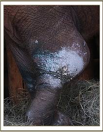 Little stoic Luggard quickly became a part of our baby herd, remaining closer to home, and a firm favourite of orphans Tamiyoi and Jotto. He savoured his freedom from the outset, and did not let his broken leg hamper his activities, as he loved to revel in the soft damp grass after a rain shower, splashing in muddy wallows, or rolling in the cool damp earth. Over the ensuing months, we watched as our little boy not only began to heal but his body condition improved enormously, with his indomitable spirit prevailing throughout. Over the months, fragments of bone were expelled in pockets of pus where the bullet entered and exited his leg