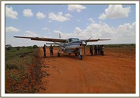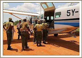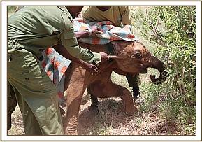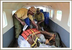 After the initial rescue the baby was held at the KWS rhino field base at Lugards until the SWT Keepers arrived on the scene, landing on close by on a bush airstrip. With the Keepers now on the ground the calf was swiftly prepared for the flight and taken to the airfield in the back of a land-cruiser before being airlifted in a Cessna Caravan aircraft to Nairobi.