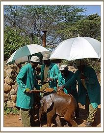 After taking some rehydration her front legs and back legs were carefully tied and she was loaded into the small plane and flown directly to Wilson Airport in Nairobi. The moment she stepped onto the airfield apron she lay down and rolled around on the loose gravel, enchanting all those that looked on with absolute amazement and she seemed oblivious to the busy airport around her. Later she followed Benson past the aero planes, the fuel bowsers and the gawking onlookers to the aircraft hanger where a land rover waited to transport her the short distance between Wilson Airport to the Trust’s Nursery in Nairobi National Park. No one could believe this tiny fuzzy bundle of mischief, who soon took over the Nursery compound. After a drink of water and a splash and spill from the bucket she flopped down wiggling away in the small muddy patch which had formed as a result of the spilt water. One by one all the Keepers came to view this cheeky little newcomer who was happy to follow everyone and anyone.