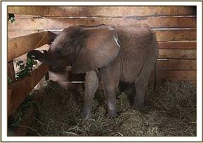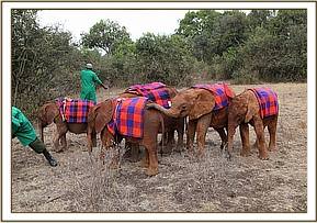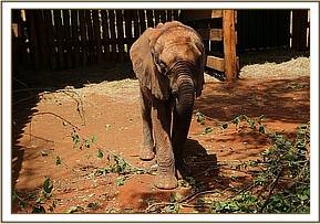 It is thought that her mother must have left her the night before, or early that morning as she was too weak to keep up with the herd. She was incredibly fortunate that help, arrived before a pride of lions killed her instead of the unfortunate Oryx on which they were feeding when the rescue team arrived. By the time the five month old calf arrived at the Nairobi Nursery, she had regained sufficient strength to be able to get to her feet.