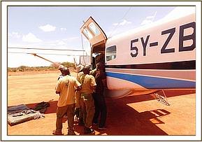Once our teams arrived on the scene, she was cooled down and shaded from the unforgiving sun whilst a lifesaving IV drip was prepared for her after which she was loaded into the waiting Landcruiser and driven to the stockades where more treatment could be administered while the team awaited the arrival at the Voi Park airstrip of the Rescue Plane from Nairobi. To begin with the calf hardly stirred, but slowly she came to life and then hope was restored. She was immediately fed water by mouth which cooled her down. In the meantime Angela Sheldrick had prepared everything at the Nursery for her arrival, and a team of Keepers was dispatched to board the plane. Everyone worked rapidly at the other end to ensure a speedy turn around while she was again placed on IV fluids for the duration of the flight to Nairobi, which would involve approximately 1 1/2 hours.