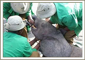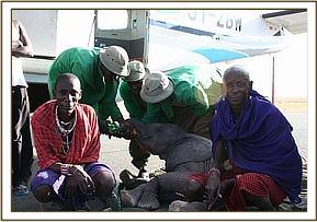 On the Amboseli airstrip the calf was fed, and later prepared for the flight. All the while her two Masaai rescuers were very much part of proceedings and eager to see her saved, and helping load her onto the waiting aircraft.