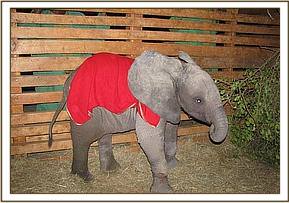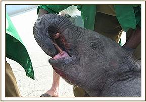 She is a chubby and healthy looking little calf of about three months old. We called her Mawenzi as it seemed appropriate to name her after one of the peaks of Mt. Kilimanjaro, the majestic mountain in whose shadow she was born. Once at the Nairobi Nursery she soon latched onto the other two little orphans in the nursery, Suguta and Ndii, who continue to take a great interest in her. She has terrible bruising on her back where she must have rubbed raw while trying to extract herself, but other than that she seems in good condition. We hope and pray her bruising does not turn into the suppurating wounds that Sinya, who shared the same fate, had to endure. Clearly she misses her elephant family enormously, but it is amazing the calming influence the other nursery orphans have on the new babies, and Mawenzi is no exception.