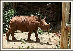 The 6th February 2007 began as an ordinary day, but ended up anything but ordinary due to the discovery of blind yearling baby rhino in the Park forest about 3 kms. from our Headquarters. The elephant Keepers, who were out in the forest as usual with their charges, heard the rhino crying, and went to investigate. He was running around aimlessly, there being no sign of his mother. The KWS Rhino Unit was summonsed, and together they and our Keepers monitored the little rhino until dusk from a good distance so as not to disturb him or the possibility of his mother returning, and when there was still no sign of the mother, something had to be done to spare him from being taken by predators during the night. By calling him with the rhino “come” sound (a soft exhalation of breath), he followed the Elephant Keepers and KWS Rangers for the 3 kms until near the Trust buildings, when he spooked at the strange sounds, blindly charging all and sundry and almost downing Daphne in the process who had to resort to diving into a nearby bush! By now it was quite obvious that he was completely blind in both eyes, for both his eyes were opaque. He was then physically overpowered, which took all the strength of about l0 men and although just a year old, he could certainly pack a punch and was immensely powerful. With legs tied he was then carried on the elephant Rescue Tarpaulin to a vacant stable, where he was released, and proceeded to almost demolish the timbers of the stable. Apart from his eyes, he was in good physical condition, so he could not have been without his mother for long. (Her disappearance and ultimate fate still remains a mystery.)