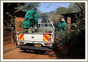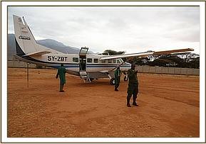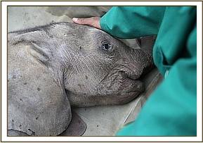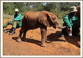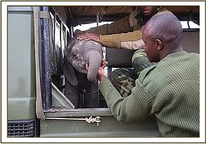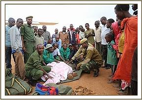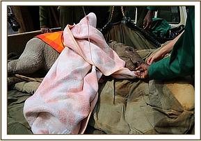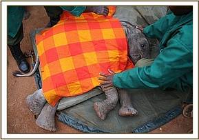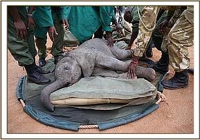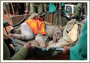 The DSWT team landed at 11:35am and were met by the KWS rangers with a tiny baby elephant in the back of their landcruiser. Immediately a bottle of milk (formula) was given and the baby was then prepared for the flight back to Nairobi. He was severely dehydrated and to be safe was placed on a drip.