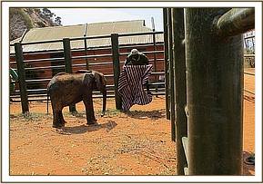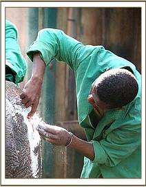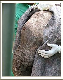 We did not expect this calf to even come round, let alone live, and contemplated removing the drip to allow her to slip away peacefully to end her agony and suffering. However, much to everyones astonishment, she was up by 9 a.m. the next morning but still harbouring extreme hatred of humans. However, she was sufficiently weak for the Keepers to be able to restrain her and offer her milk and water from a bottle, which she drank hungrily, desperate for more. However, the fighting spirit was still with her, and the Keepers had to make a hurried escape. Since then, she will come to inspect anything white that one might be holding in the hope that it's milk, but has to be fed through the bars of the Stockade door, still far too aggressive to risk closer contact. She has to be fed water from a bottle as well, for she appears unable to draw water up into the trunk, because of the internal damage and the gaping hole at the top which prevents the suction effect.
