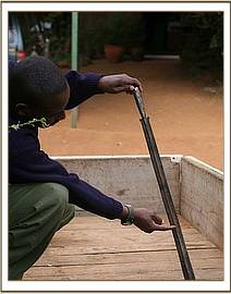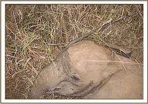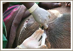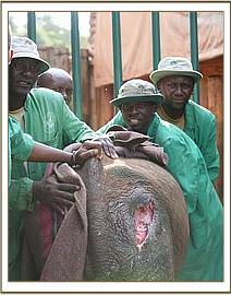 That night, the calf, who had been named Murka (after the nearby Murka Mines) collapsed and fell into a life threatening coma, which enabled us to insert an intravenous Dextrose drip into an ear vein and assess the extent of her injuries and deal with them firsthand. There was not one person present who was not horror struck and astonished that a human could be so brutal to an innocent baby that did not even have tusks! Breath was escaping through the wound in her head, and the body wounds raw and extensive. It beggared belief that humans could be so cruel and brutal to a baby elephant, especially an orphan whose mother they had probably also killed. The spear was typical of those carried by Masai tribesmen, who enjoy a reputation of being more tolerant to wildlife, but obviously the sadistic owner who inflicted such horrendous injuries on an innocent baby elephant does not fall into that category!