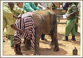Whilst working in Amboseli National Park, the Trusts Mobile Veterinary unit, funded by Vier Photen, headed by Dr. Jeremiah Poghorn, received a report of 2 abandoned elephant calves in Tsavo West National Park, one on Muhoho Ranch(rescued later and named Makireti) and the other near Rombo which had a spear deeply embedded in its forehead.