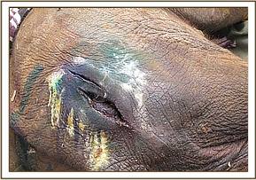 Deciding to deal with the injured Rombo calf first, the team arrived in the area at about 2 p.m. during the afternoon of 7th July, 2010 and were directed to the general location of the calf by a Ranger. The orphan was soon spotted, running from a nearby stream to hide in thick bush. A long spear, bent backwards, was protruding from its head lodged deep into the skull midway between the eyes. There were also other wounds on its body, one near the tail being very deep and fresh, exposing raw flesh and likely to have been caused by an axe.
