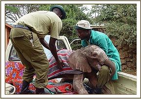 His desperate state remains a mystery, was the female his mother without sufficient milk, or was she not his mother at all as he had obviously been without milk for many days? What was clear to everyone was that without help this calf was certainly not going to make it. He was called Ndololo after the area where he was found, the Walingulu word for ‘place of water’, ironic as fluids is clearly something that he has lacked in his short life. As dawn broke everyone was deeply relieved to learn that against all odds he still was alive, and spending more time on his feet, nevertheless collapsing regularly. A rescue aircraft was mobilized and he was loaded onto the Cessna 206 and flown to the Nairobi Nursery. He lay motionless throughout the whole flight, but once landed when loaded onto the pick up truck he managed to stand on wobbly legs. He was later carried into a freshly prepared stable where he immediately slept some more. But with continuous rehydration and a weak milk mixture he seems to be getting stronger. He seemed initially only to be able to walk in small circles, and it seems that he does not have the sight in one eye, but he is getting stronger forty eight hours after his rescue.