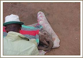 This all took place not further than 1/2 kilometers from the Voi Unit stockades in Tsavo East National Park, at 5.00 in the afternoon, and once back at the stockades the calf was laid down on a mattress while the vet examined him. He had obviously been without milk or water for some time, as his skin was totally dehydrated, his eyes sunken and unable to open, and the veins behind his ears almost non existent. The Keepers were able to ensure some rehydration got down him while he lay on the mattress motionless but for the sucking of the teat. It was also observed that this calf despite being so young had very worn pads to his tender young feet suggesting that in his short life he had walked great distances already. He was estimated to be 2 – 3 weeks old.