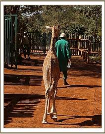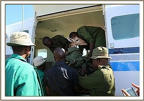 He was flown to the Nairobi Nursery by Sky Vet, sparing him what would have been a gruelling and very hot seven to eight hour journey by road and being the first time our Keepers had been involved in the rescue of an orphaned giraffe, they were fully briefed about the necessity to ensure the giraffe’s head remained upright at all times throughout the flight. On this occasion the usual elephant-rescue tarpaulin had to be modified into a make-shift cradle and throughout the entire procedure the little giraffe was seemingly totally resigned to whatever lay in store for him.