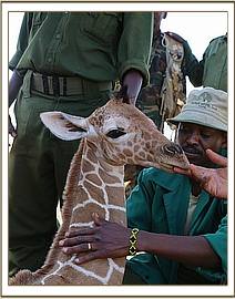 On the 19th of September KWS Officer Bernard Rono, who heads the DSWT funded Meru mobile Veterinary Unit, reported having received a baby male reticulated giraffe estimated to be just one week old, which had been rescued by KWS rangers on the Meru National Park boundary