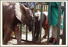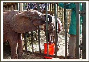 Upon arrival, at 5 p.m.. he was given the prophylactic antibiotic injection before being untied, when, in order to avoid being crushed, everyone had to make a hurried exit as he got to his feet. Desperately thirsty, he took water from a bucket placed outside the Stockade, but the sight of a human, even one holding a bottle of milk, provoked an angry reaction. However, during the night he drank milk from a bucket, and by the next day would accept it from the bottle, having seen all the other Nursery inmates drink theirs in this way. Administering the second of the three antibiotic injections needed also proved quite a challenge. A blanket had to be thrown across his head, whilst some l0 men rushed in to restrain him in a corner so that the Vet could deal with him. It took him a week to settle down but now he is as docile as all the other orphans.