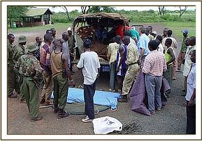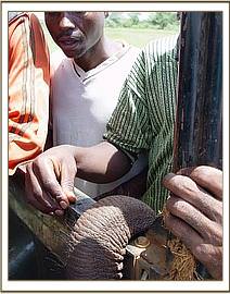A phone call from Mark Jenkins, Warden of Meru National Park, on the 25th April 2005 alerted us to the fact that he had spotted a young elephant, all alone and far from any other herds, who was obviously an orphan, and too young to survive without milk. Whilst we prepared all the gear, yet again, for the second rescue within a week (little Kora being the first), the Meru Park Rangers set forth to capture the calf, who turned out to be a bull just short of two years old, with tusks just visible through the lip but still very strong, although terrbly thin, prominent cheek bones indicating a starvation case who had been without his mother’s milk probably for over two weeks. (No calf younger than 2 can survive without milk, even though they may be eating vegetation, and those orphaned between the ages of 2 and 5 seldom make it without nutritional supplementation in the form of coconut, which contains the right sort of fat a young elephant needs for survival).